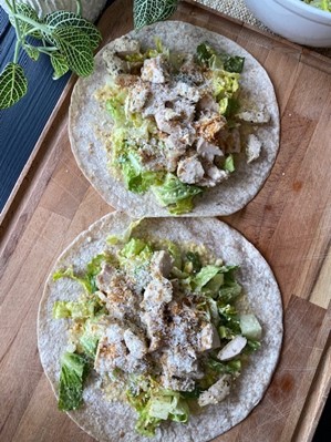 - Chop and wash the romaine and add to a large bowl. Add the Caesar dressing but reserve a small amount. Toss until the lettuce is coated. Spread the reserved dressing on each wrap. Add the Caesar salad, chicken and sprinkle on the panko. I like to add some frank’s hot before I roll them for some added spice.