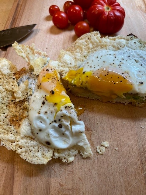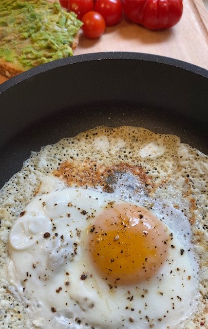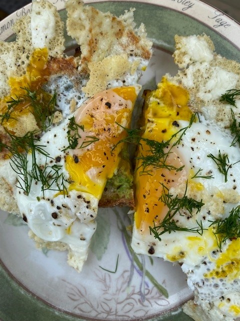 - Heat a fry pan to medium low heat. Add the olive oil and once the pan is hot, sprinkle in the feta. Let this fry for a few minutes or until it starts to turn slightly golden. Crack in the eggs. If the cheese is starting to get too golden turn the pan down. Cover with a lid and cook for a few minutes until the white of the egg is cooked but the yolk is runny. Serve on toasted bread with avocado.