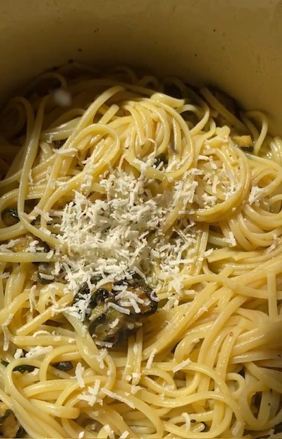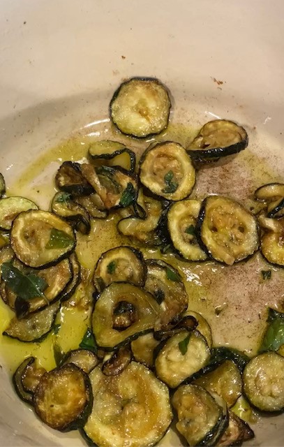 - Add 4 tbsp of the oil that the zucchini was frying in to you’re the Dutch oven that was used to fry the zucchini in. Heat the pot to med and add the garlic. Add the zucchini and remaining basil. Stir this as the pasta cooks. Remove 1 ½ cups of pasta water and set aside.