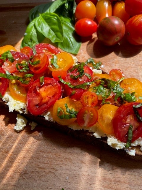 - Layer on the ricotta, cherry tomatoes and drizzle with olive oil and balsamic. Season with salt and top with freshly chopped basil.