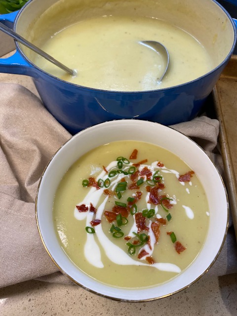 Potato and leek soup is a classic fall soup that many love and it’s one of my favourites. It’s silky, creamy and has a subtle onion flavour. This version uses one leek because at the time of making this recipe I only had one leek on hand. In replace of the remaining leeks that I would have preferred to use, I substituted with white onion and it turned out just as good! This soup is so easy to make and it’s freezer friendly too!! I added some crispy prosciutto on top (doing this is a sin in my Italian culture but I didn’t have any bacon ) green onion and full fat yogurt.