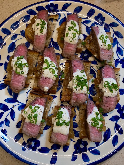 - Assemble the crostini. Add the onions, sliced steak, and horseradish cream.
