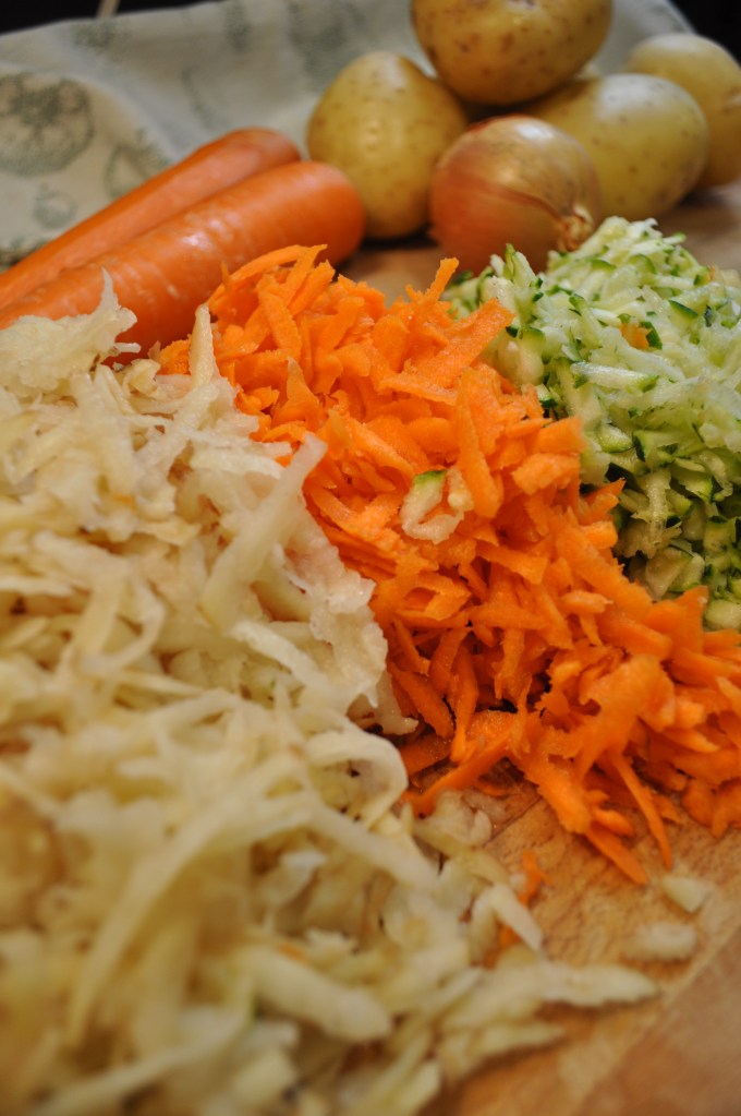 - Peel the carrots and potato and shred them using a cheese grater. Squeeze out the potato to remove any liquid. Add to a large bowl. Shred the zucchini and squeeze out any liquid. Dice the onion finely and mince the garlic. Add all of these to the bowl with the carrot and potatoes.