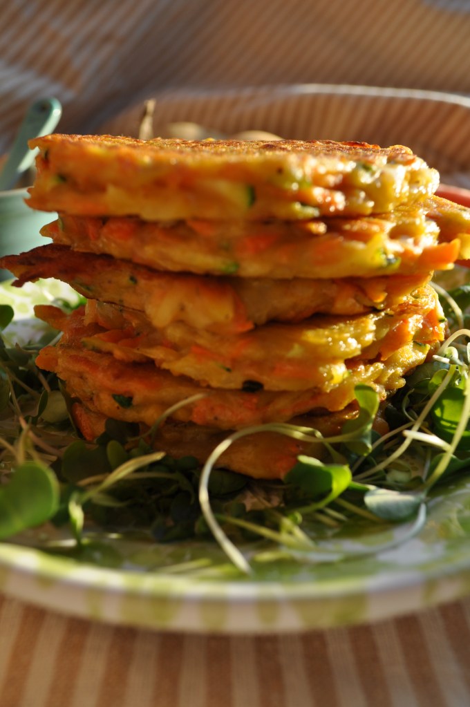 - Heat a large non-stick fry pan to medium heat and add half of the 1/4 cup of olive oil or avocado oil. Once the pan is hot, drop in 1 tbsp spoon of the batter and flatten it down with the spoon once in the pan. Fry these for 2-3 three minutes per side or until golden. Once they are cooked and removed from the pan, sprinkle them with flaky salt. Serve with a dallop of yogurt dipping sauce.
