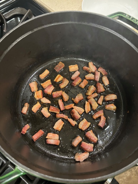 - Heat a large Dutch oven to medium low heat. Add the guanciale to the cold pan with a drizzle of olive oil and let the fat begin to rendure. Let this crisp until golden brown. Turn the heat off and remove the guanciale with a slotted spoon and set aside in a bowl. Pour the fat out into a bowl, leaving about 1 tsp in the pan.