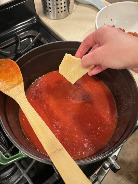 - Add the crushed tomatoes, chili, guanciale, sausage and parmesan rind. Bring this to a gentle simmer and then turn the heat to low. Cook for 30 minutes, stirring every 5 minutes ensuring that the sauce doesn’t stick to the bottom of the pot.