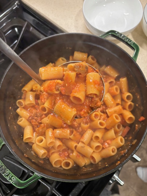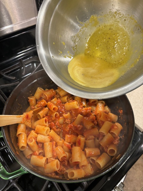 - Bring a large pot of salted water to a boil (the water should be salty like the sea). Cook the rigatoni for 2 minutes less than what the package says.