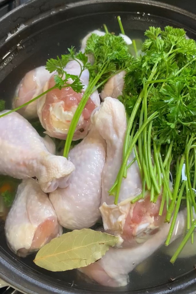 - Once it has finished cooking, remove the bones, celery and herbs. Strain the broth to remove any small bones and the chicken meat back into the stock.