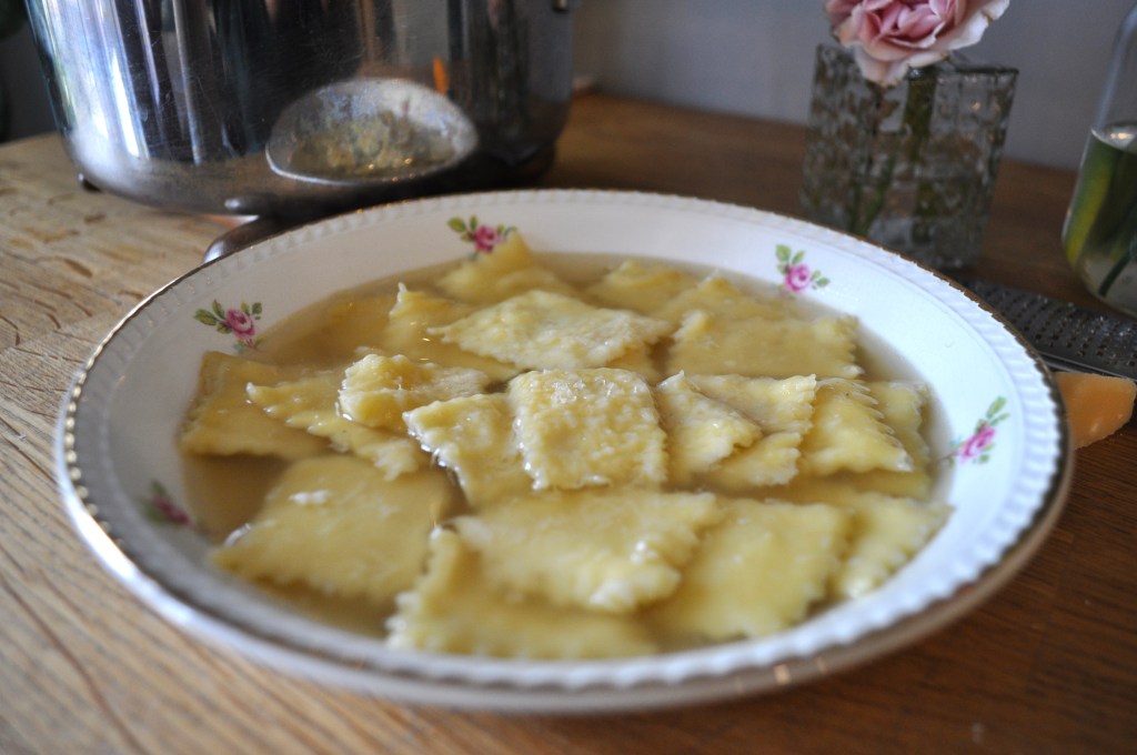 For the pasta dough I always use Lidia Bastianich’s recipe from her cookbook, Mastering the Art of Italian Cuisine (which is a fantastic cookbook by the way). I use the light egg pasta dough recipe and it turns out perfect every time! I also recommend making your own homemade chicken broth. The store bought stuff is just not the same. I have a recipe for my chicken stock that is very easy to make and trust me, you will notice a difference in taste compared to store bought!