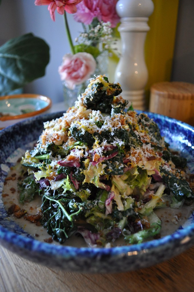 - Add the greens to a large bowl and add 5-6 tbsp of the tonnato sauce. Add white wine vinegar and olive oil. Toss and coat the greens in the sauce. Season with salt and pepper to taste. Add 4-5 heaping spoons of the tonnato sauce onto a large serving platter. Arrange the lettuce over the sauce and top with freshly grated lemon zest, Parmigiano Reggiano and breadcrumbs.