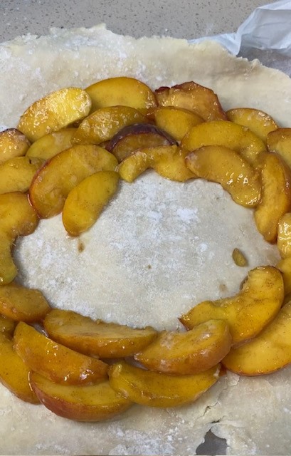 - Arrange the peaches in a circular pattern over the dough working from the outside in and leaving a 2” border of dough. Add lemon zest on the peaches.