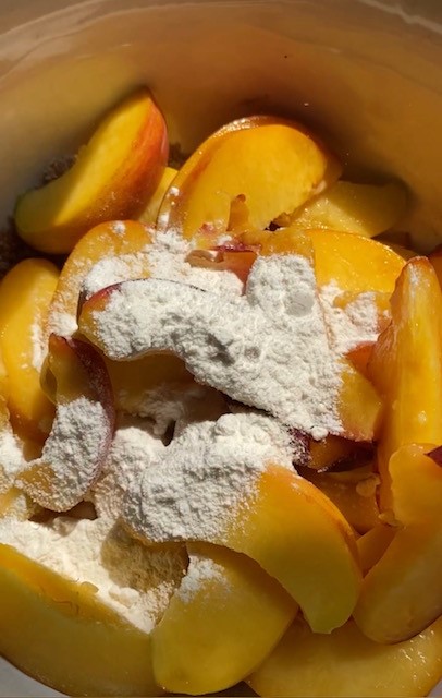 - To a large bowl add the sugar, cinnamon and vanilla. Mix to combine. Add the peaches and the flour. Toss this gently to combine.