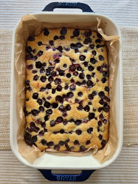 During the summer months, I always like to take advantage of the fresh local fruit. This means eating it fresh and also experimenting with new baking recipes. I typically gravitate towards making fruit filled galettes during the summer simply because they are super easy to make and are great to make in advance for a dinner party. I also love making cakes in the summer while fruit is at its peak. I was at my friend’s cottage recently and she made a strawberry snacking cake. This cake was love at first bite. The outside was crunchy while the inside was moist and filled with beautiful summer strawberries. This cake is so easy to make and it disappeared quickly once I served it! When I made this cake I had fresh blueberries and the cake turned out fantastic! You could also make this cake with raspberries or peaches. After you make this cake, you will see how quickly it disappears! It’s an easy dessert to bring to a backyard BBQ or if you’re hosting. I haven’t tried it yet, but this cake would be delicious with a scoop of vanilla bean ice cream.