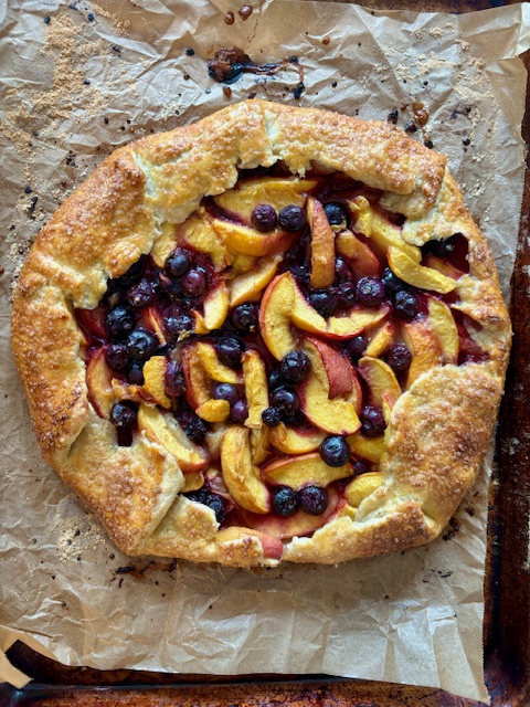I love making galette’s during the summer months when seasonal fresh fruit is at it’s prime. During August I love making peach galette’s and in late August and early September you will always find an heirloom tomato galette in my house. During July and August, when peaches are at their peak, I love making a peach and blueberry galette. The peaches are sweet and fragrant and they are a perfect compliment to the blueberries. This is a fantastic dessert to serve at a dinner party or if you are invited over to a backyard BBQ. It’s delicious served warm with a scoop of vanilla ice cream or cold out of the fridge.