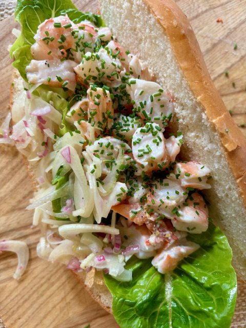 - Toast the brioche buns in the oven. Assemble by adding a piece of gem lettuce, the shrimp mixture and fennel slaw. Garnish with chives.