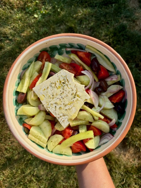 - Cut the tomatoes into quarters and add to a medium size bowl. Peel and slice the cucumber in half then chop into half-moons. Slice the red onion and add to the bowl. Toss the vegetables in olive oil and salt. Add the kalamata olives and capers. Place a large chunk of feta top of the vegetables. Drizzle the feta with extra olive oil and sprinkle the oregano on the feta cheese. Finish with flaky salt.