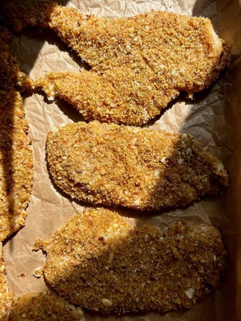 My mom always taught me that the key to making a great chicken cutlet is to butterfly the chicken and to pound the chicken. By pounding the chicken with a meat mallet, it ensures that you will have even pieces of chicken which will cook at the same time. Typically, chicken cutlets are battered in flour, egg and breadcrumbs and then fried until golden. I find that battering and frying each individual chicken cutlet can be very time consuming, the oil makes a mess and the kitchen smells of oil once you’re done cooking. I was curious to try baking them in the oven to see if they had the same taste and crispiness. I was sceptical to try this method because I didn’t want to compromise on the taste and crispiness of the chicken cutlet. To ensure that my cutlets would be the crispiest. I made my own breadcrumbs by toasting homemade sourdough bread in the oven. Doing this creates so much flavour compared to a breadcrumb you would buy from the store. The texture is also incredible when you make your own breadcrumbs because you can control the size of the crumb. Needless to say, baking the cutlets was a great decision because they turned out crispy and golden. By baking them, you spend less time in the kitchen and there’s less of a mess to clean up. I can’t stand frying things because then you have to deal with discarding the oil and cleaning your stovetop. I really think you will love this method of making chicken cutlets. Making your own breadcrumbs is an additional step and is optional. You can definitely make this recipe using your favourite breadcrumbs from the store which would also cut the prep time in half.