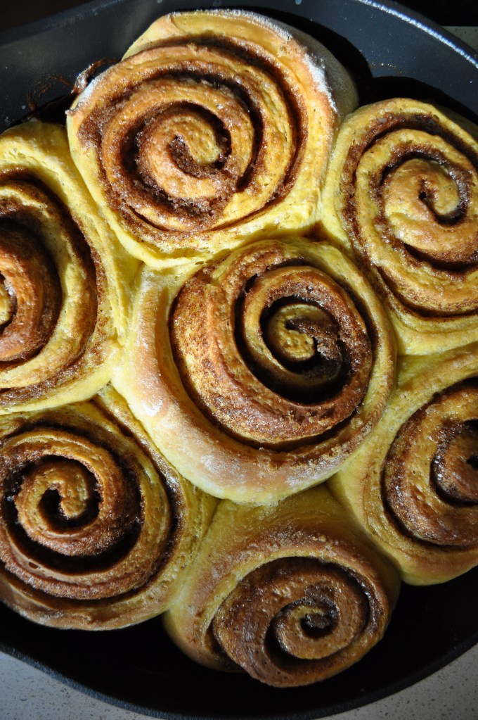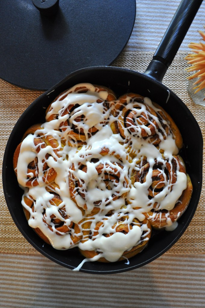 It recently dawned on me that one of the first desserts I’ve ever made was cinnamon rolls in my home economics class in high school. I remember thinking that they were the easiest and most delicious thing to make! I have not made them since and was pleasantly surprised to find that they were indeed quite easy to make. The hardest part is waiting for the dough to proof. Once the cinnamon rolls come out of the oven, I allow them to cool slightly. Once they have cooled, I slather the warm rolls with maple cream cheese frosting. These warm and ooey, gooey pumpkin cinnamon roll are the perfect weekend treat. These pumpkin cinnamon rolls are perfect to make on a cozy fall weekend at home. They will really get you in the mood for fall!