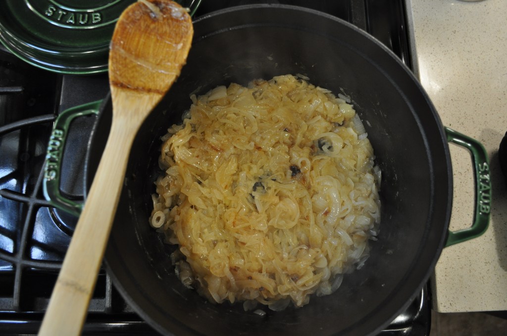 - Heat a large pot to medium-low. Add a few drizzles of olive oil and 3 tbsp of butter. Once the pot is hot and the butter is bubbling, add the onions and stir for a few minutes. Cover with a lid and cook for 20 minutes until tender and translucent. Remove the lid and turn up the heat. Stir the onions constantly until they have browned. This should take 10-15 minutes.