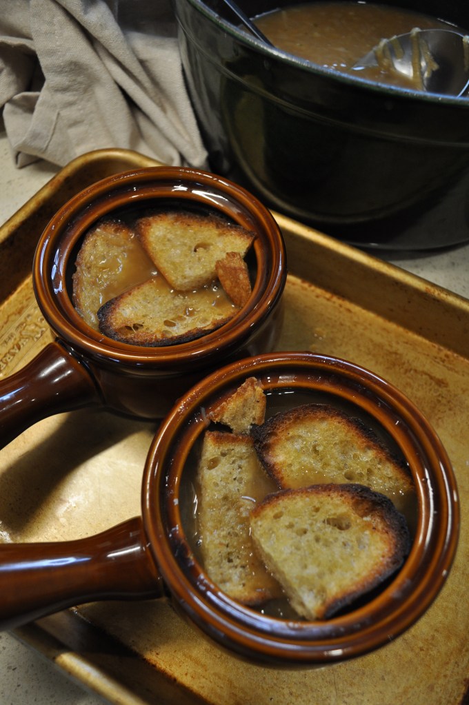 - Sprinkle a small amount of cheese at the bottom of oven safe ramekins. Ladle the soup into each ramekin and add a few pieces of crostini and top with cheese. Broil in the oven until the cheese is golden.
