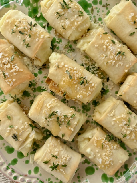Greece is clearly known for its feta cheese and while I was travelling in Greece, I had a piece of feta cheese baked in phyllo dough and drizzled with local honey. This was one of the best bites of my trip and I knew I had to recreate it. I thought it would be fun to do a play on this appetizer by making the feta wrapped phyllo into smaller bites. These feta bites are perfect to serve when you’re entertaining or if you are bringing an appetizer to someone’s house. They are one of the easiest appetizers you could make and it takes only five ingredients. For this recipe, I like to buy my feta cheese from Costco because it’s much more economical to buy it in bulk, especially if you are making a lot of these to serve at a party. You will love how crunchy and light these feta bites are! The combination of the salty, tangy feta cheese paired with sweet honey is extraordinary.