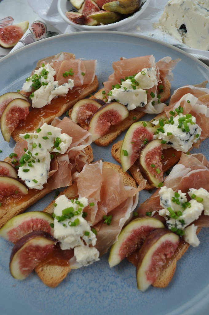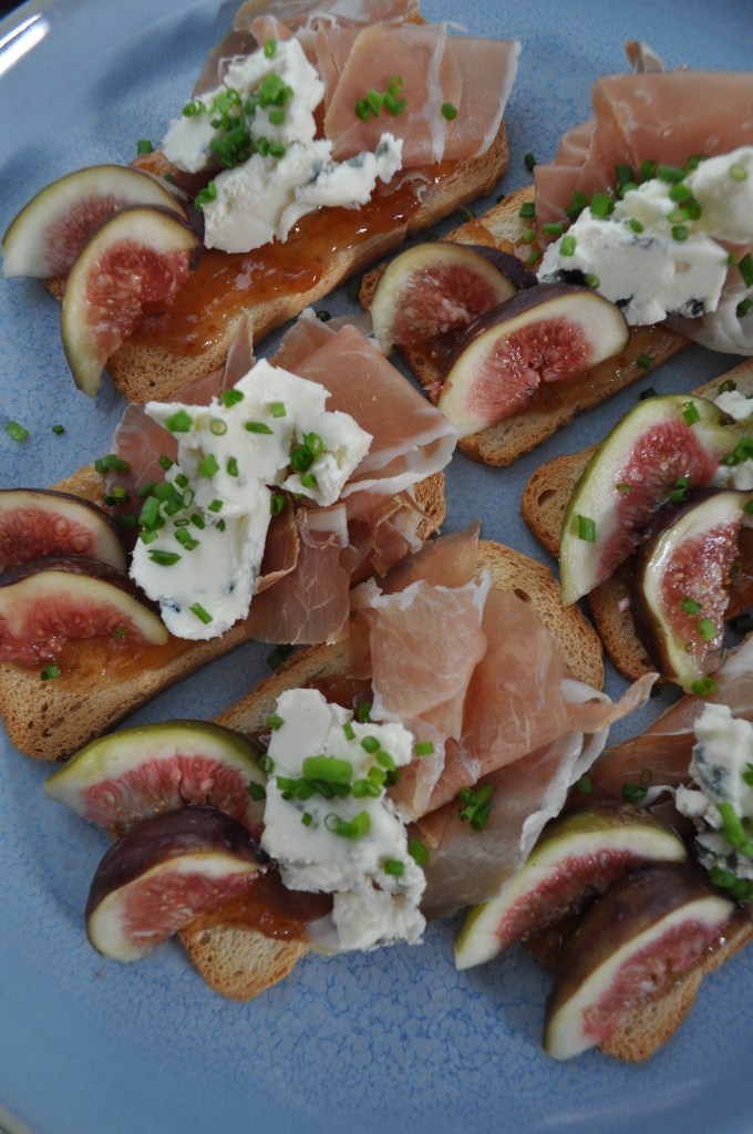 - Spread a layer of fig jam on each cracker. Add a slice of prosciutto, a piece of blue cheese and a small piece of fresh fig. Garnish with chives.