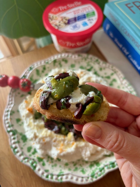 - To assemble, add the ricotta to a medium sized dish then add the olives. Drizzle with honey and extra virgin olive oil. Add a pinch of flakey salt and grate extra lemon zest on top.