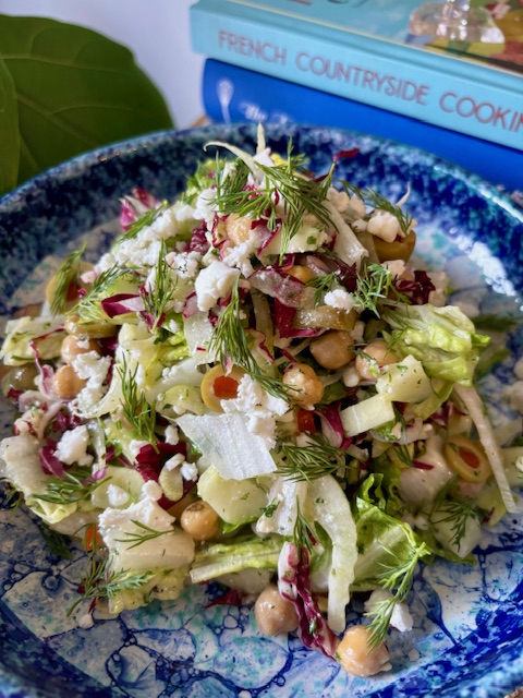 - Wash, dry and chop the romaine lettuce. Shave the fennel and radicchio. Chop the herbs and slice the olives. Add everything to a large bowl. Add chickpeas, crumbled feta, sliced olives and cucumber.